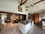 Cuisine équipée en cathédrale ouverte avec îlot centrale sur salle à manger avec poêle d'une surface de 46m²,
