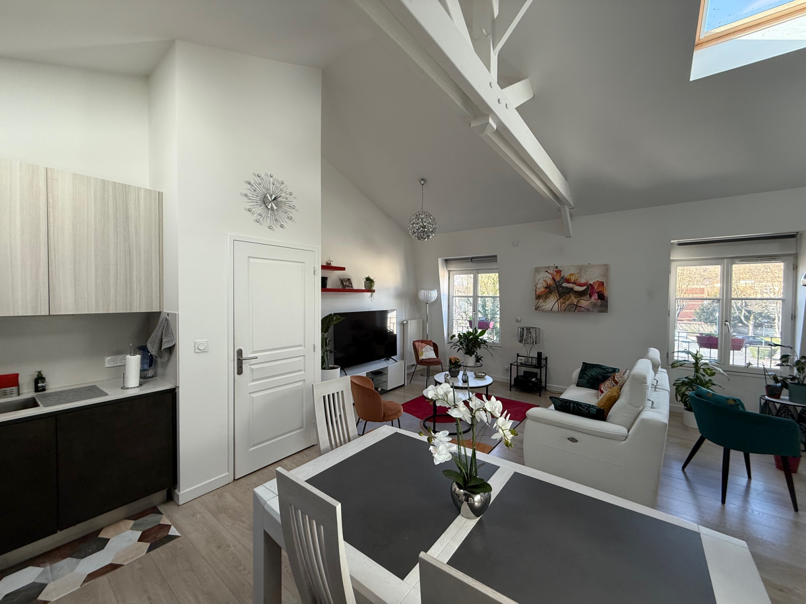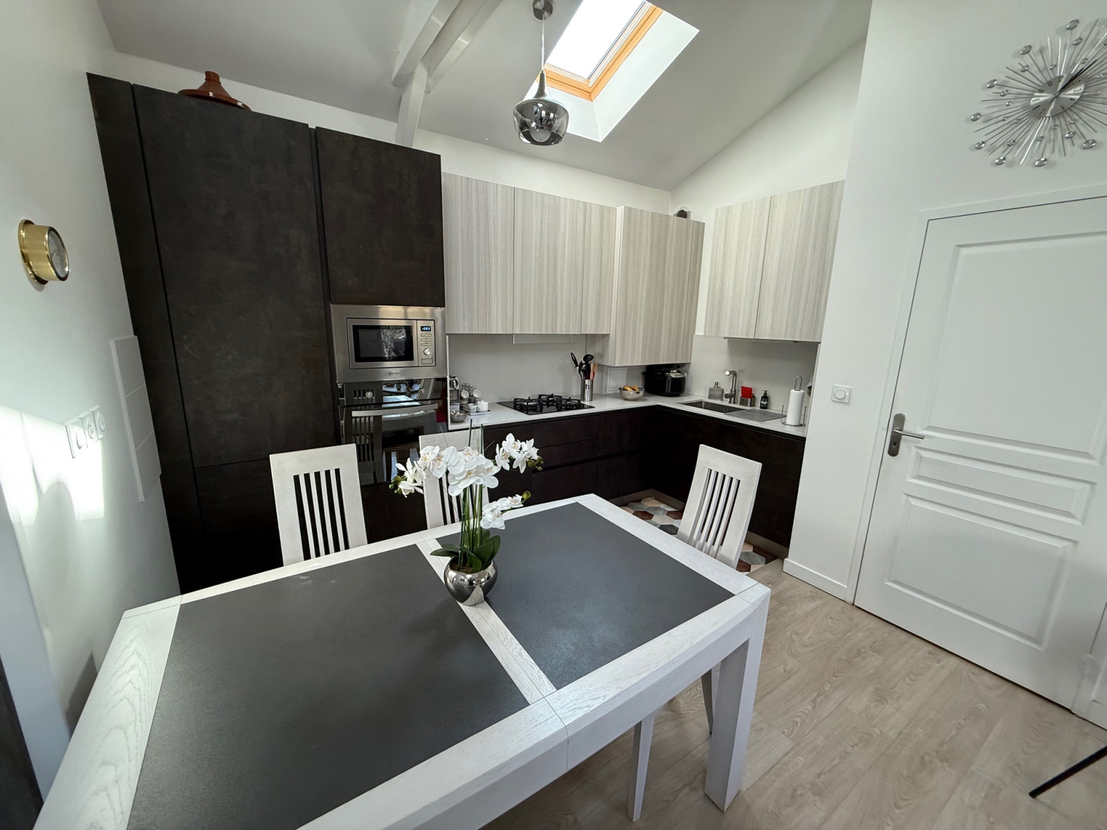 Cuisine équipée récente ouverte sur séjour cathédrale, le tout d'une surface d'environ 40m²