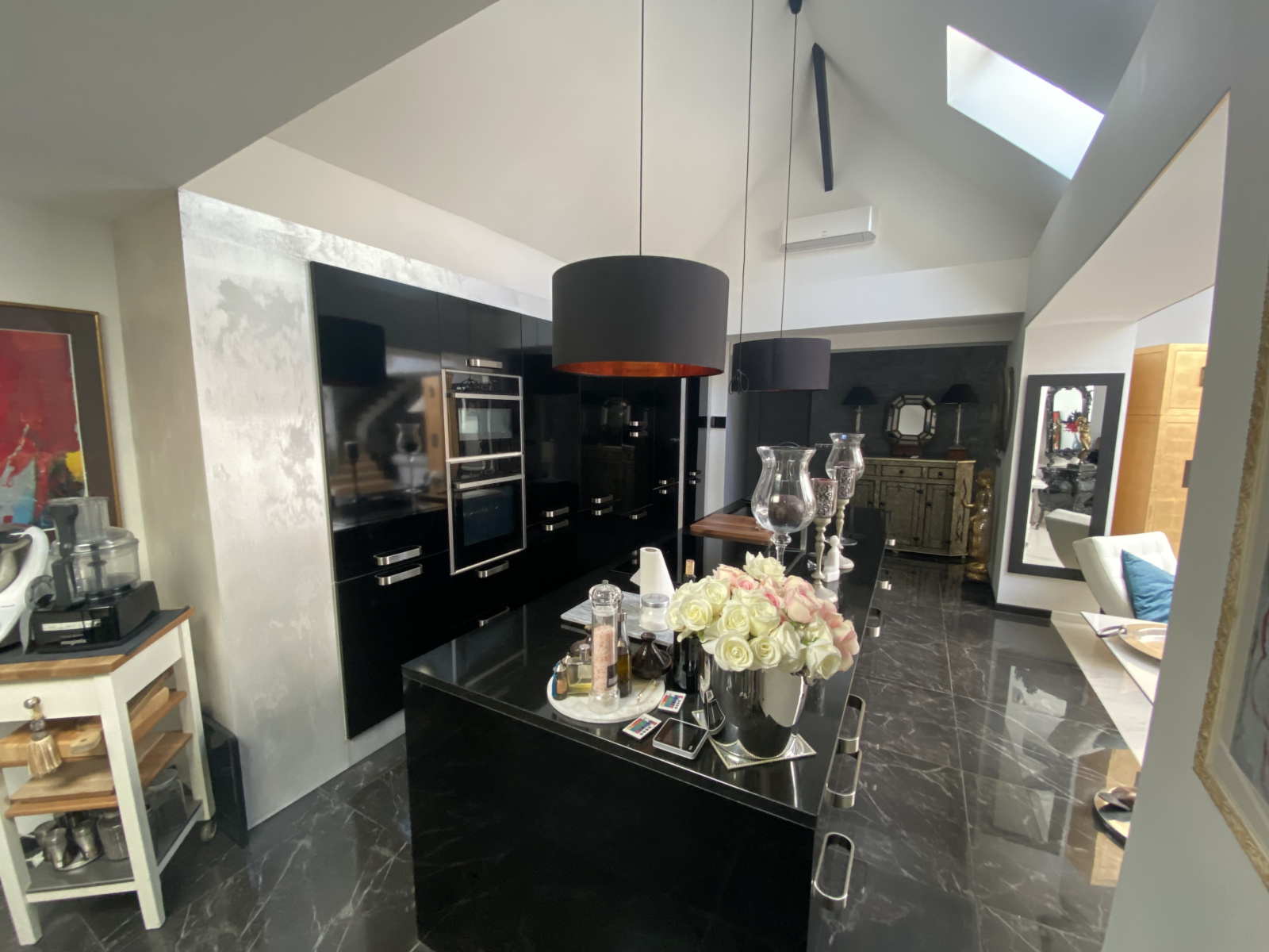 auquel s'ajoute 32m² de cuisine équipée ouverte, 2 suites parentales (chambre avec dressing et salle d'eau),
